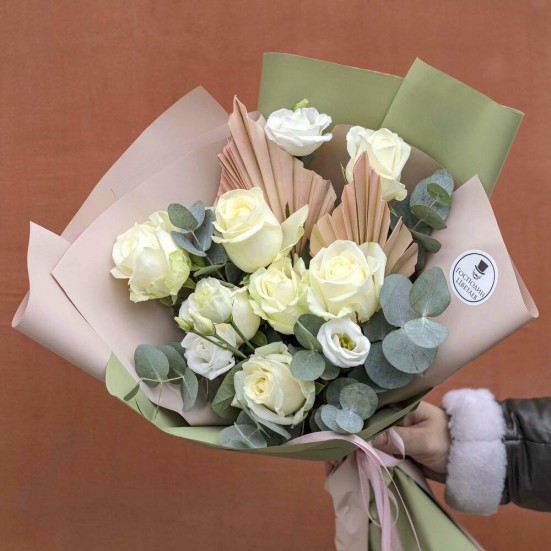 Букет из белых роз и эустомы