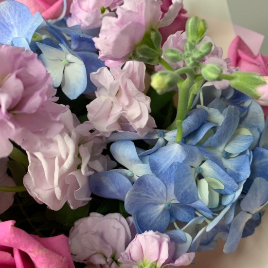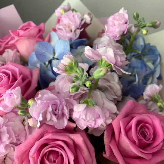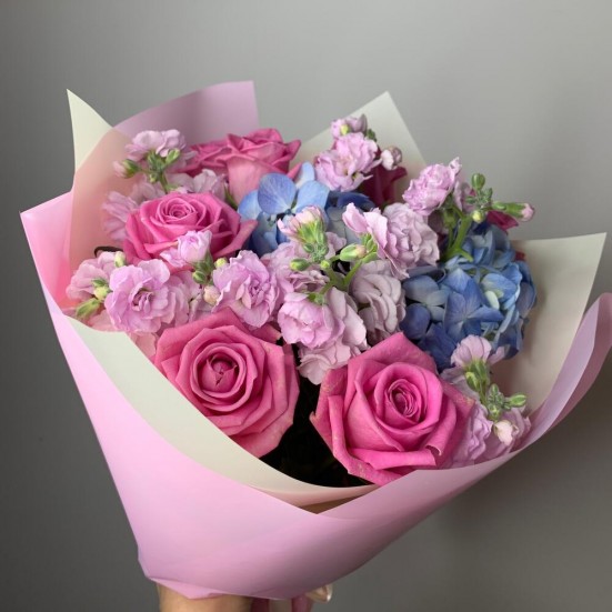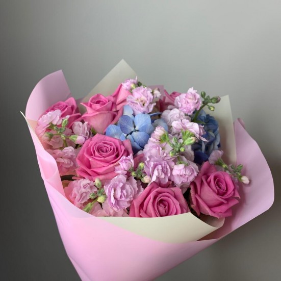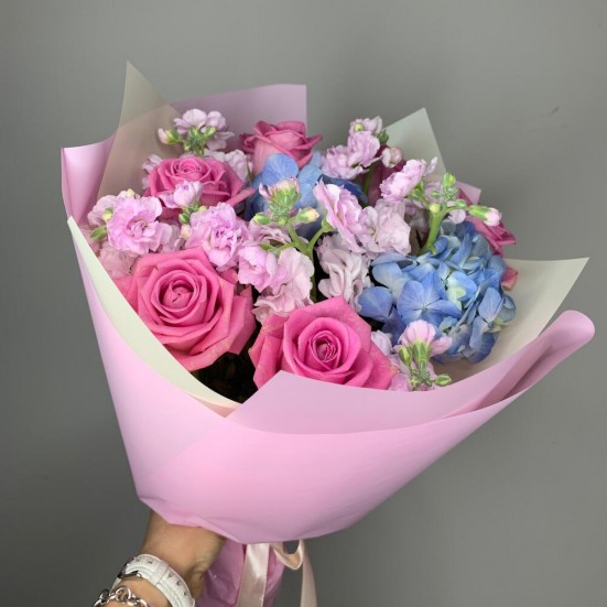 Букет с голубой гортензией и розами в Тихвине