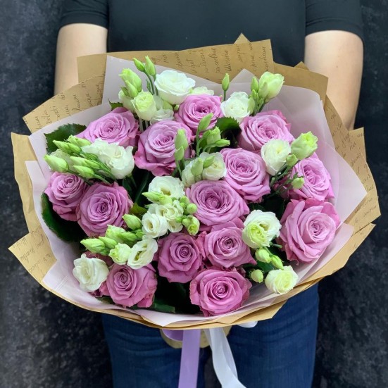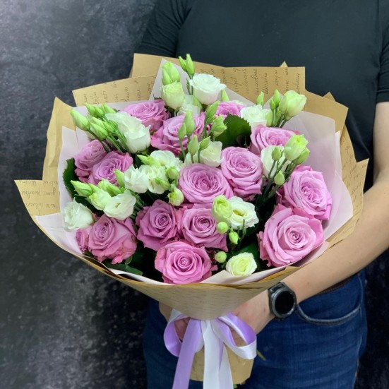 Букет с розовой розой и эустомой